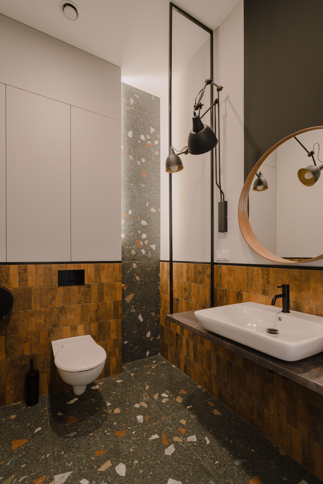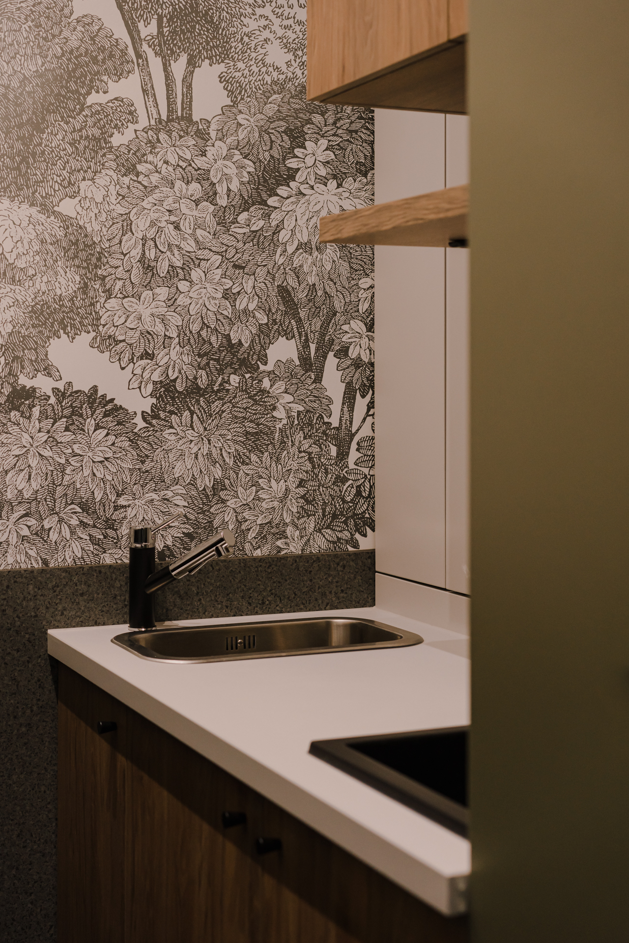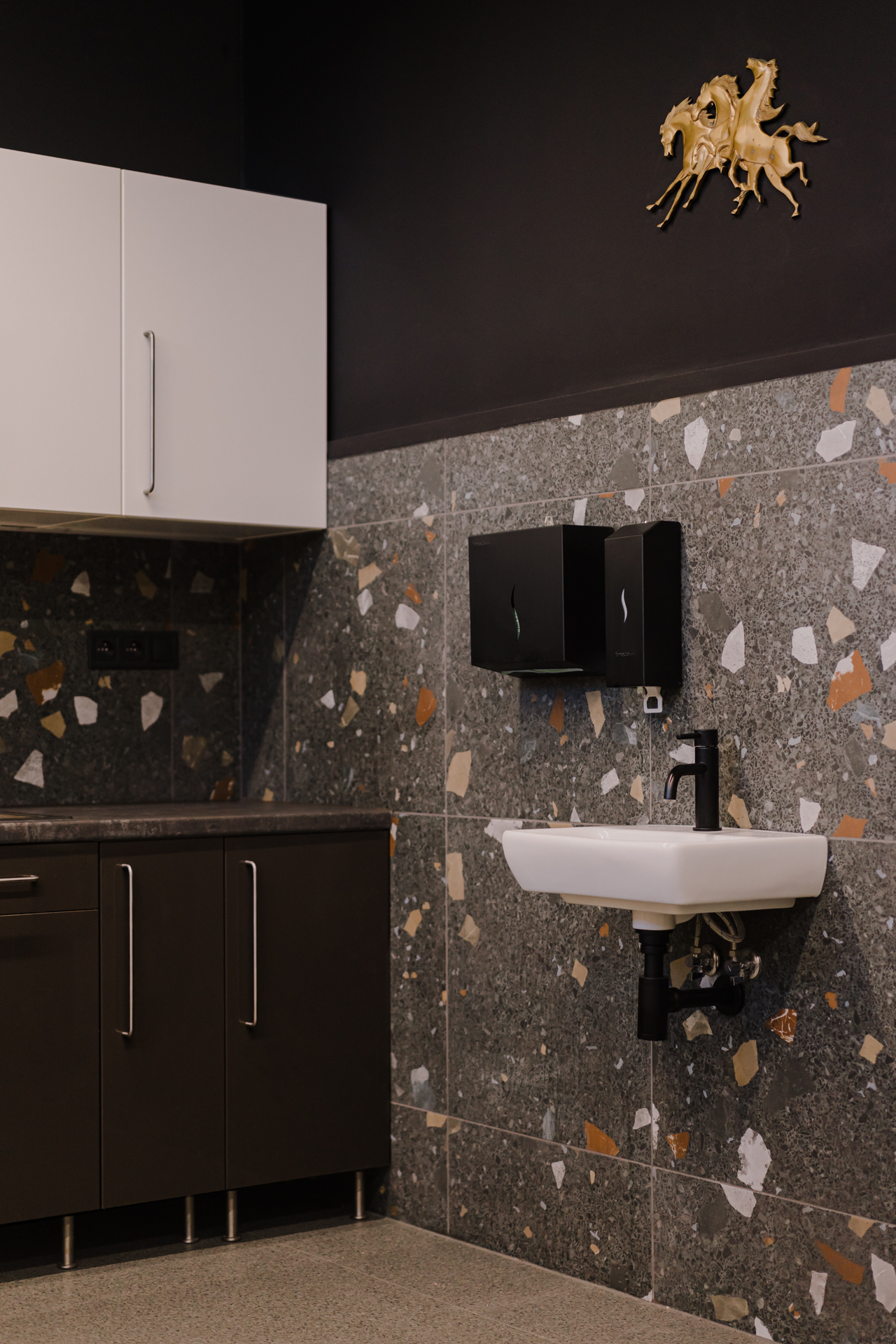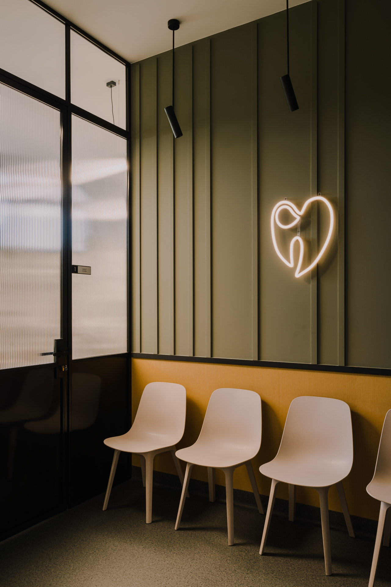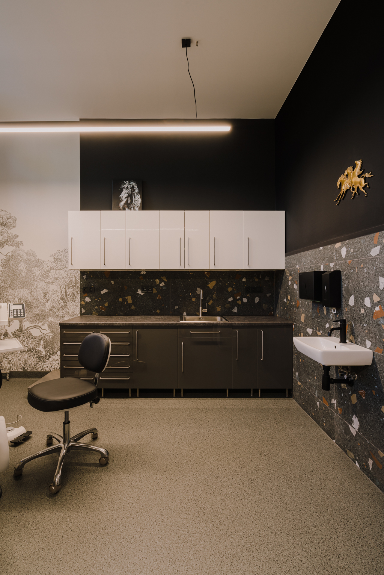 Jednocześnie wnętrze nie rezygnuje z charakteru – pojawiają się akcenty z czarnego metalu, industrialna rytmika profili i szkła strukturalnego oraz mocniejszy rysunek grafiki ściennej, które nawiązują do kontekstu miejsca i architektury budynku. Funkcjonalność, ergonomia i estetyka spotykają się tutaj w punkt, bo przestrzeń została dostosowana zarówno do pracy z pacjentem, jak i do prowadzenia konsultacji, dokumentacji i procedur higienicznych.