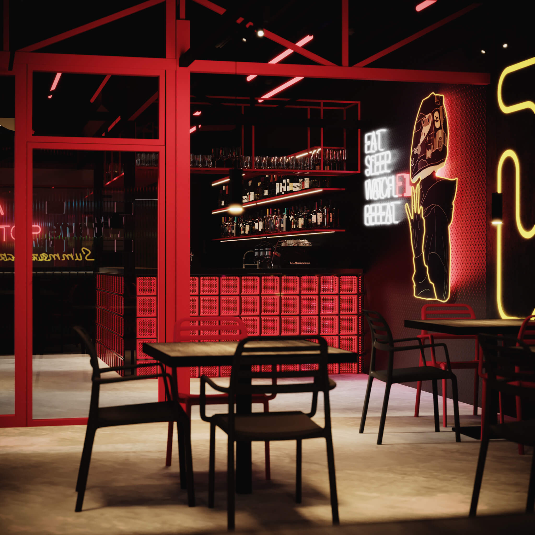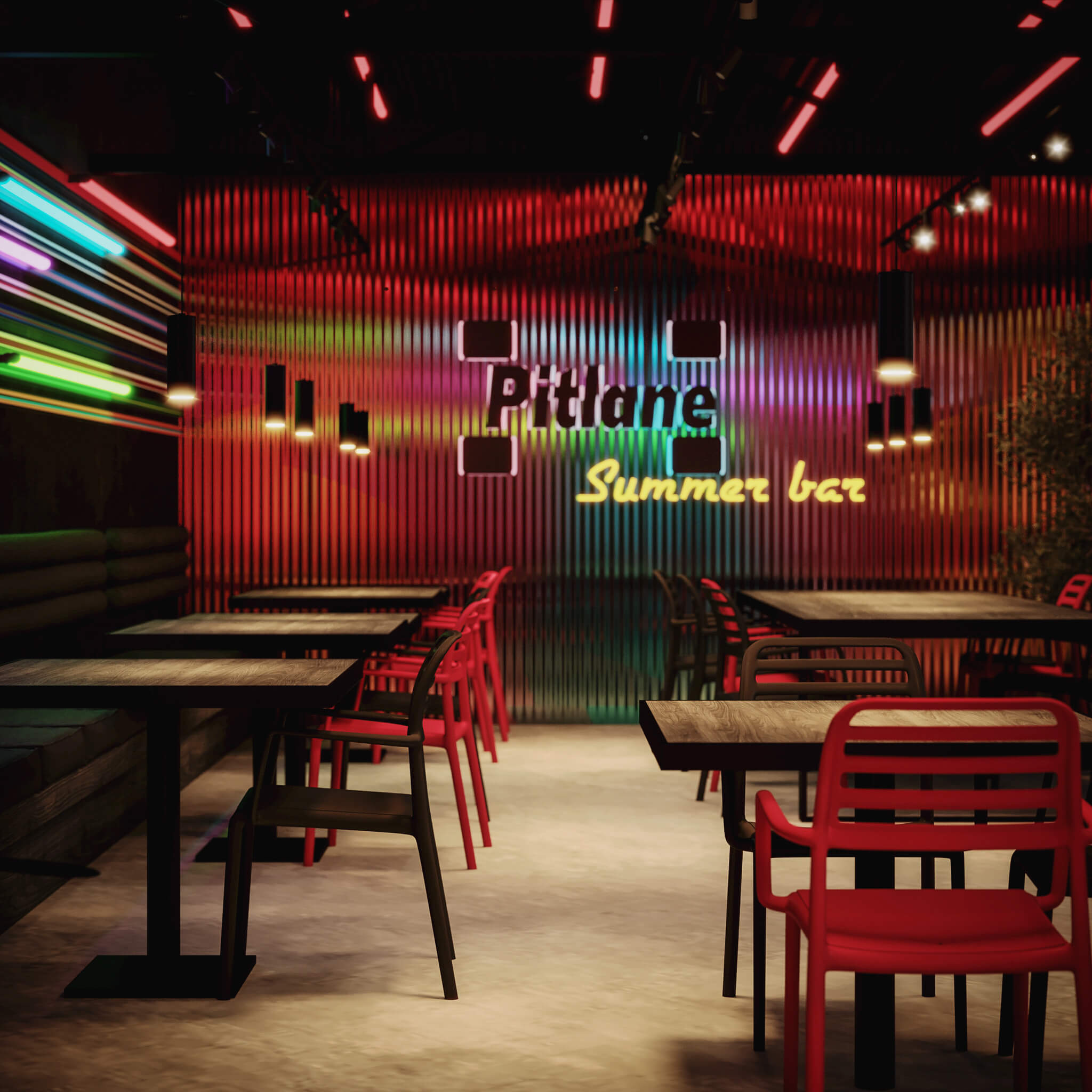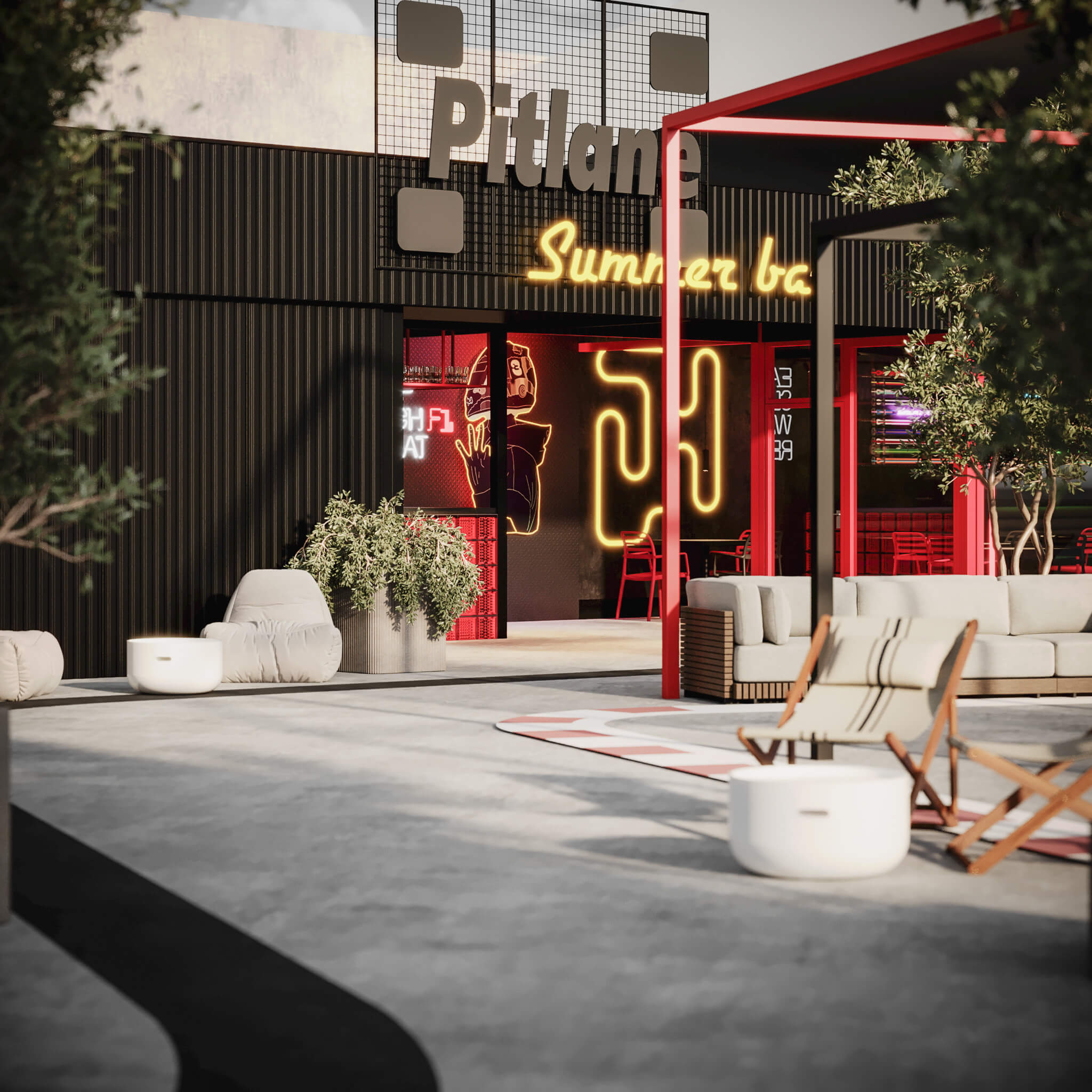 Pitlane Summer Bar to letni bar na dachu centrum handlowego Wroclavia we Wrocławiu – zrealizowany w tym samym duchu, co wnętrza toru kartingowego Pitlane. Kolorowe neony, intensywne światło i wyrazista geometria mebli tworzą atmosferę, która łączy klimat retro‑futurystycznych wyścigów z chilloutowym lounge barem.Bar został zaprojektowany jako funkcjonalne przedłużenie przestrzeni toru – z tą samą graficzną konsekwencją, typografią i paletą kolorów, ale w lżejszej, letniej wersji.Na zewnątrz znajdziemy miękkie siedziska, zadaszenia i roślinność w betonowych donicach – strefę odpoczynku z widokiem na Wrocław. Wewnątrz: czerwone kraty, czarne i czerwone krzesła, podświetlane regały z alkoholem i slogan, który mówi wszystko:EAT. SLEEP. WATCH F1. REPEAT.
