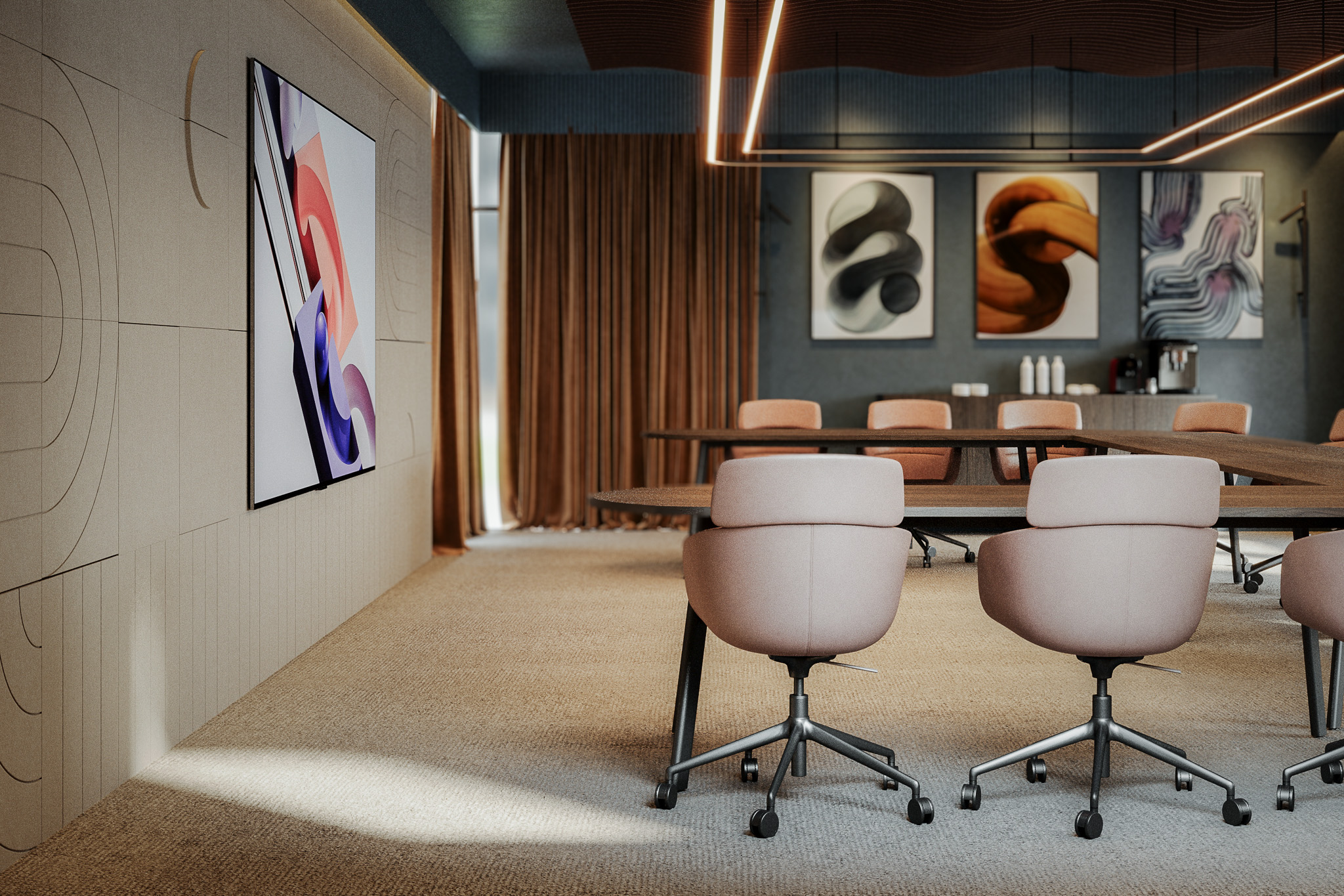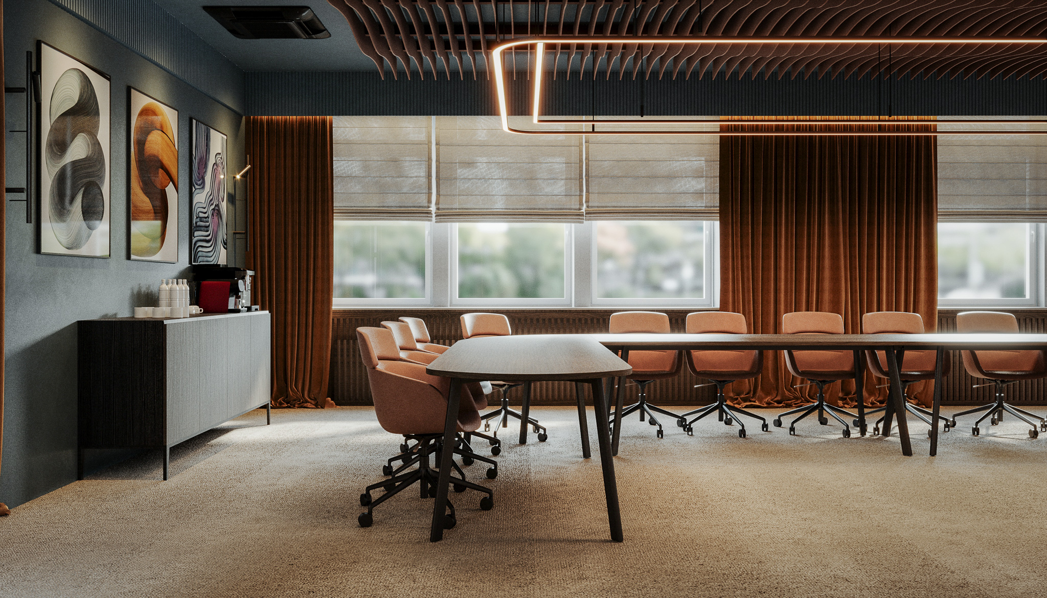 Całość zaprojektowana została z myślą o hybrydowym modelu pracy i rosnącym znaczeniu spotkań zespołowych oraz prezentacji zewnętrznych. Zapewniliśmy odpowiednią akustykę, nowoczesne wyposażenie AV oraz wygodne, ergonomiczne meble – ale to nie wszystko.
