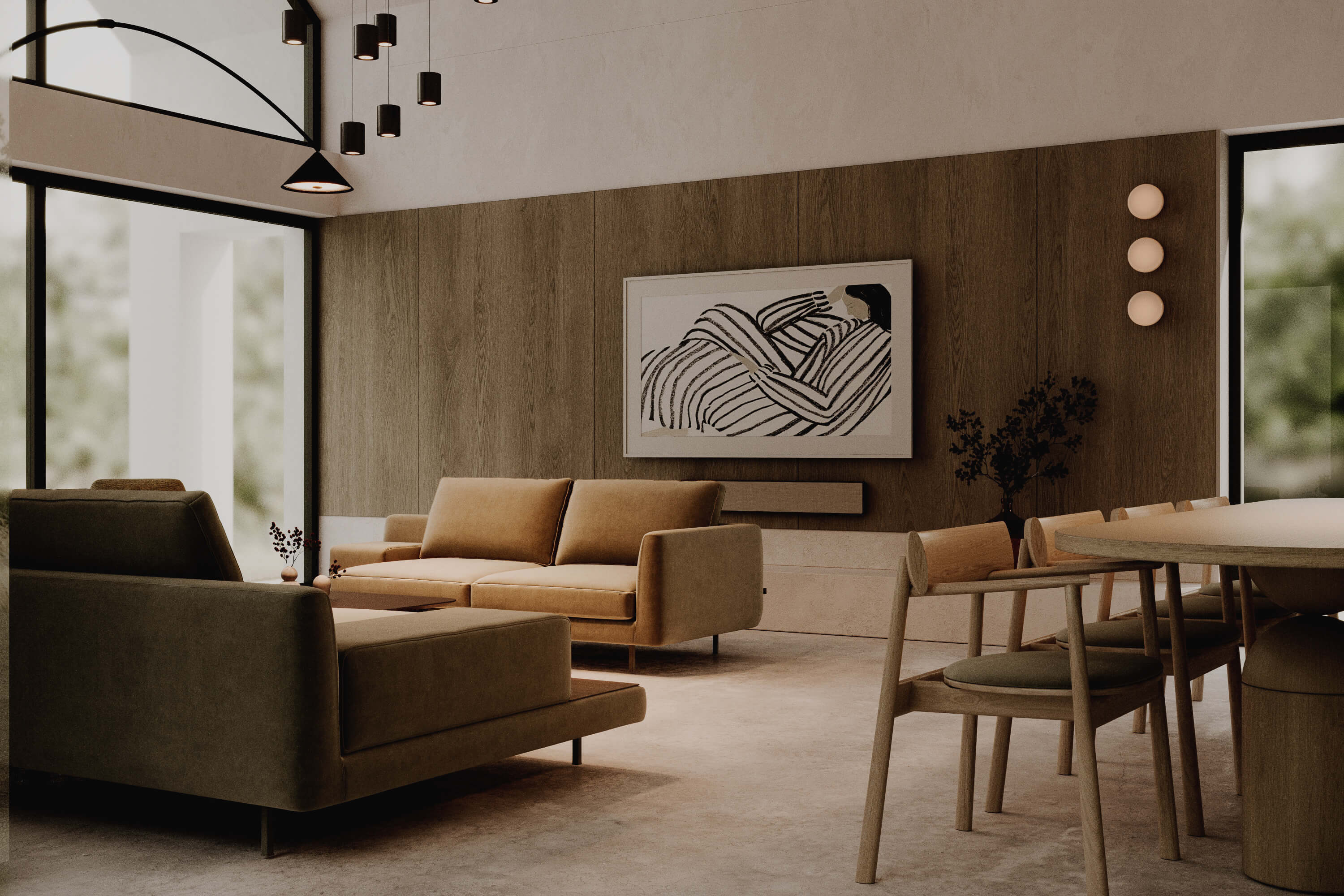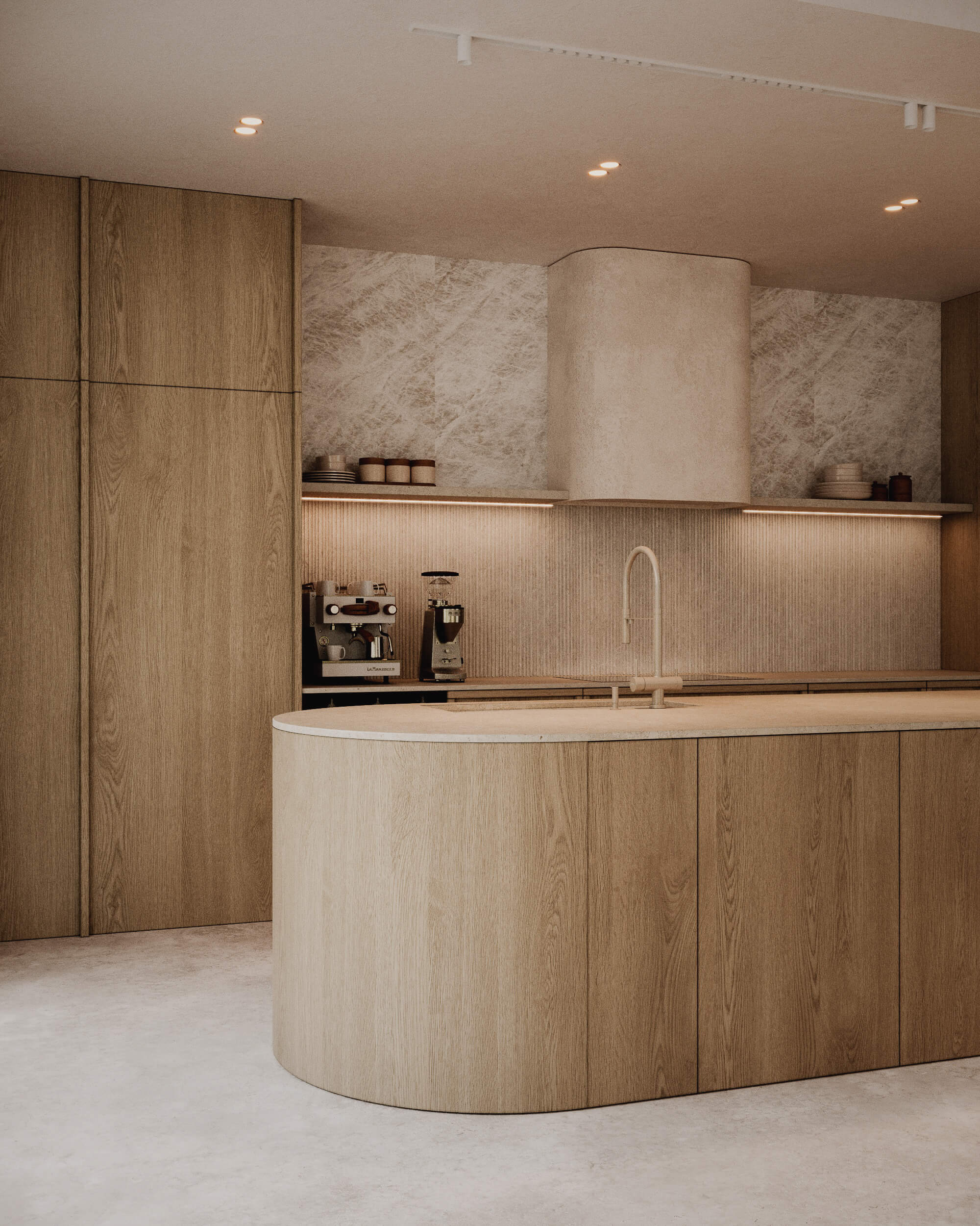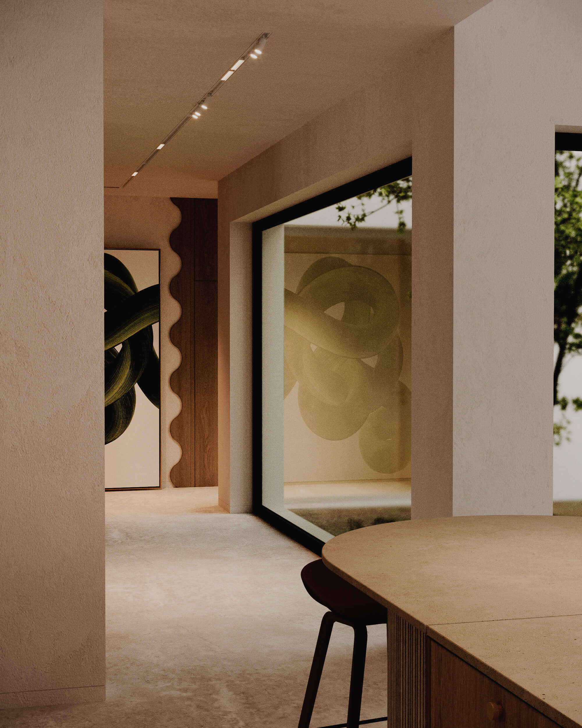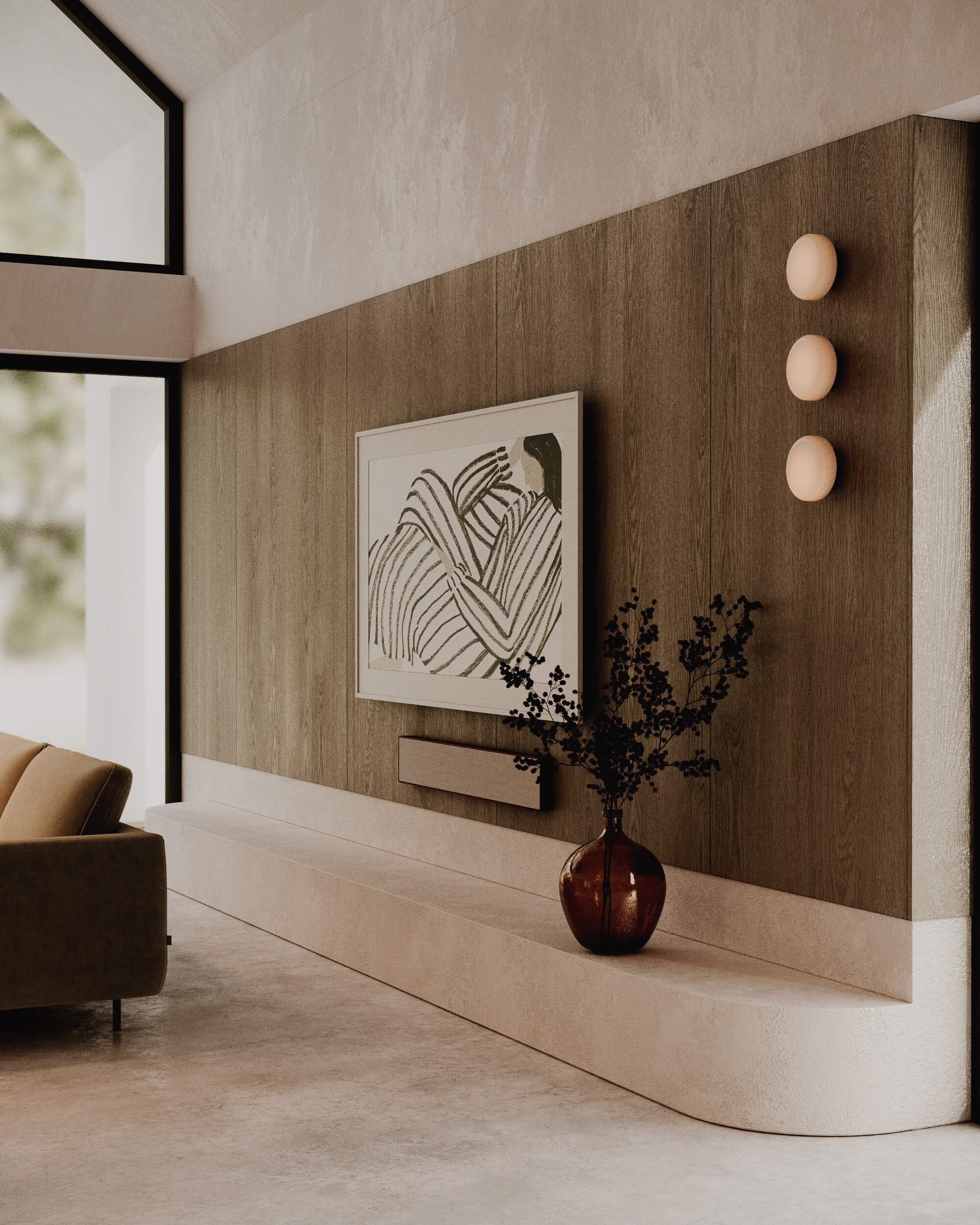 W tym projekcie płynność stała się słowem kluczem. Odeszliśmy od ostrych kątów na rzecz miękkich linii i organicznych kształtów, które naturalnie prowadzą wzrok przez kolejne strefy domu. To wnętrze miało być jak głęboki oddech – kojące, nieśpieszne, bliskie naturze.