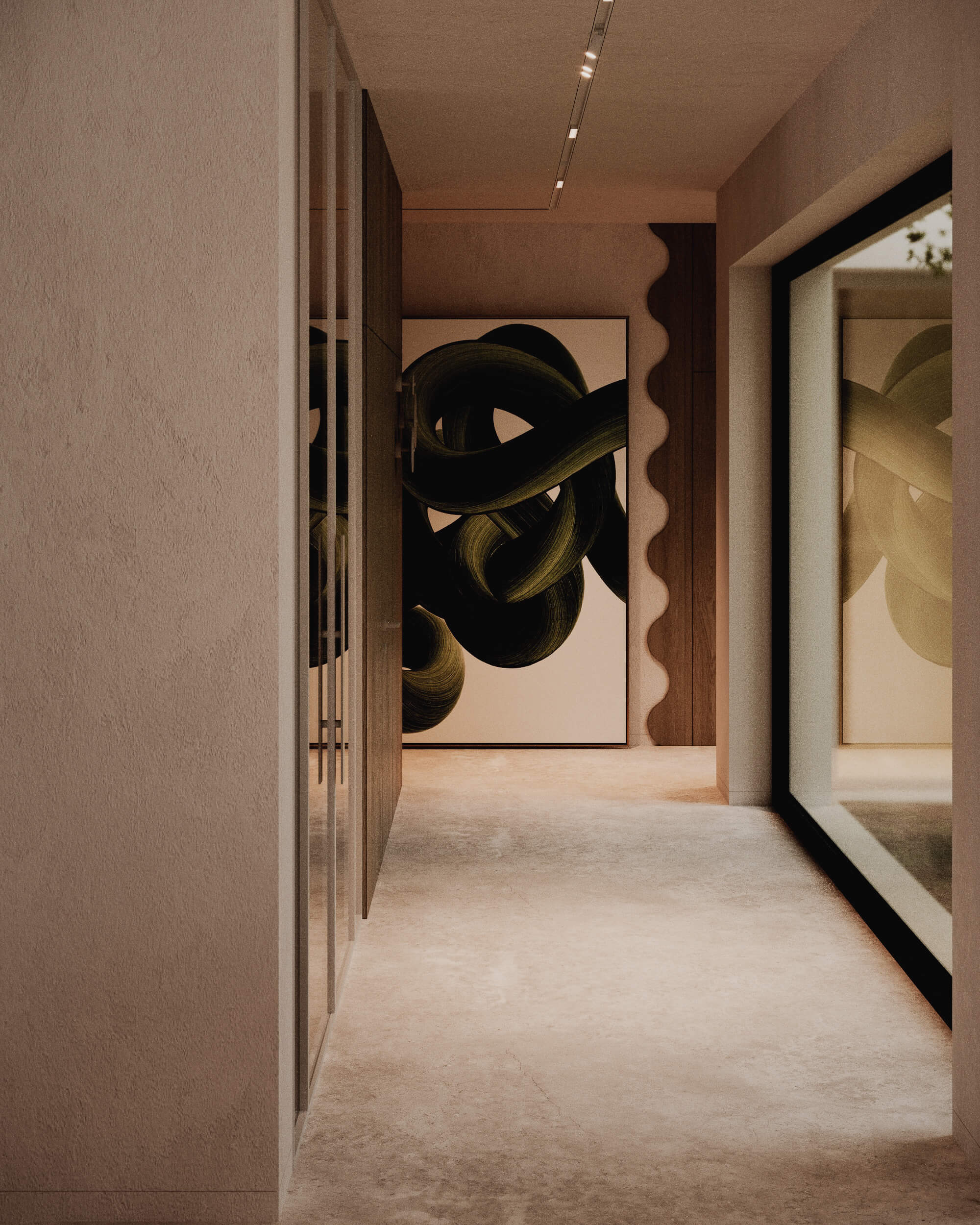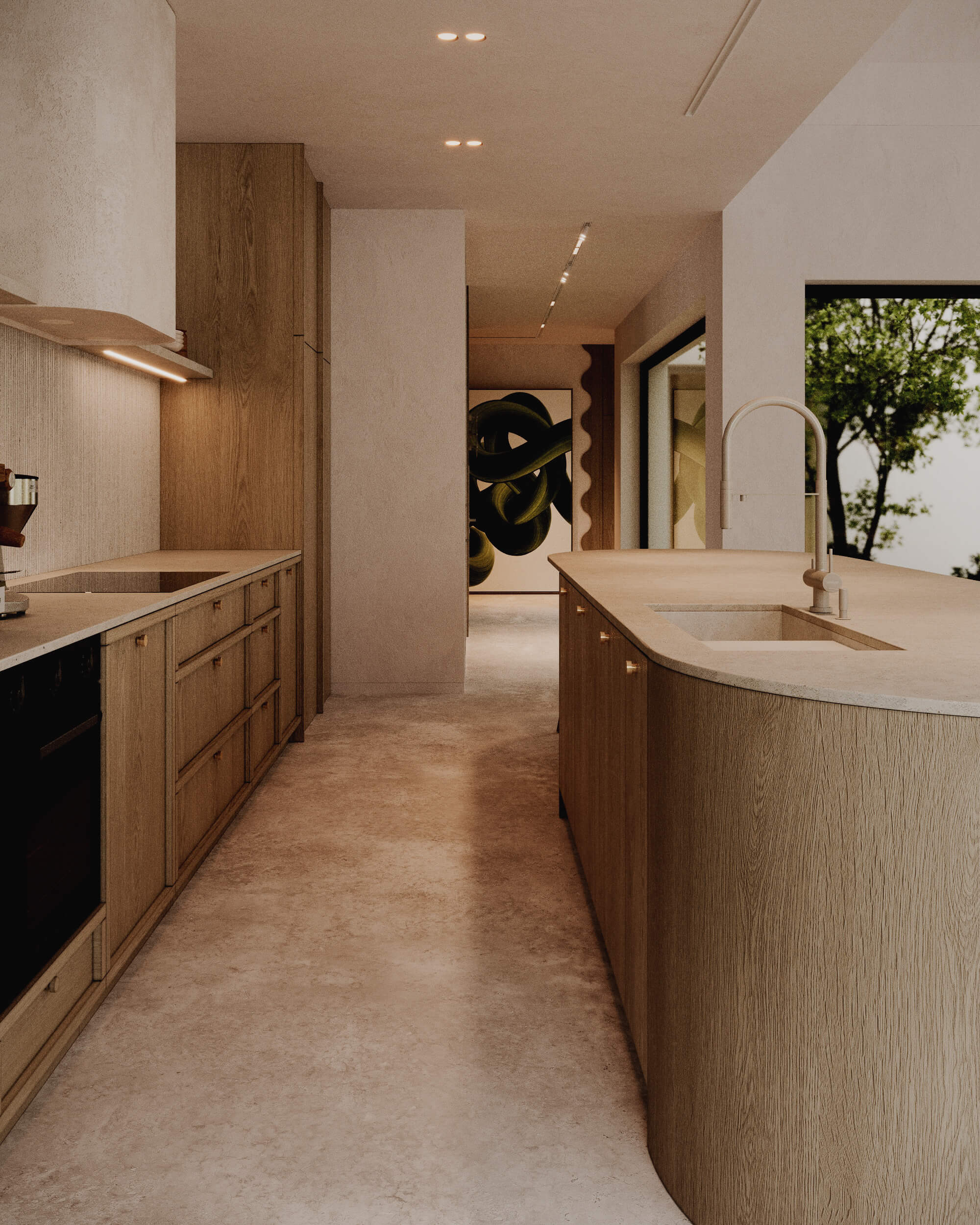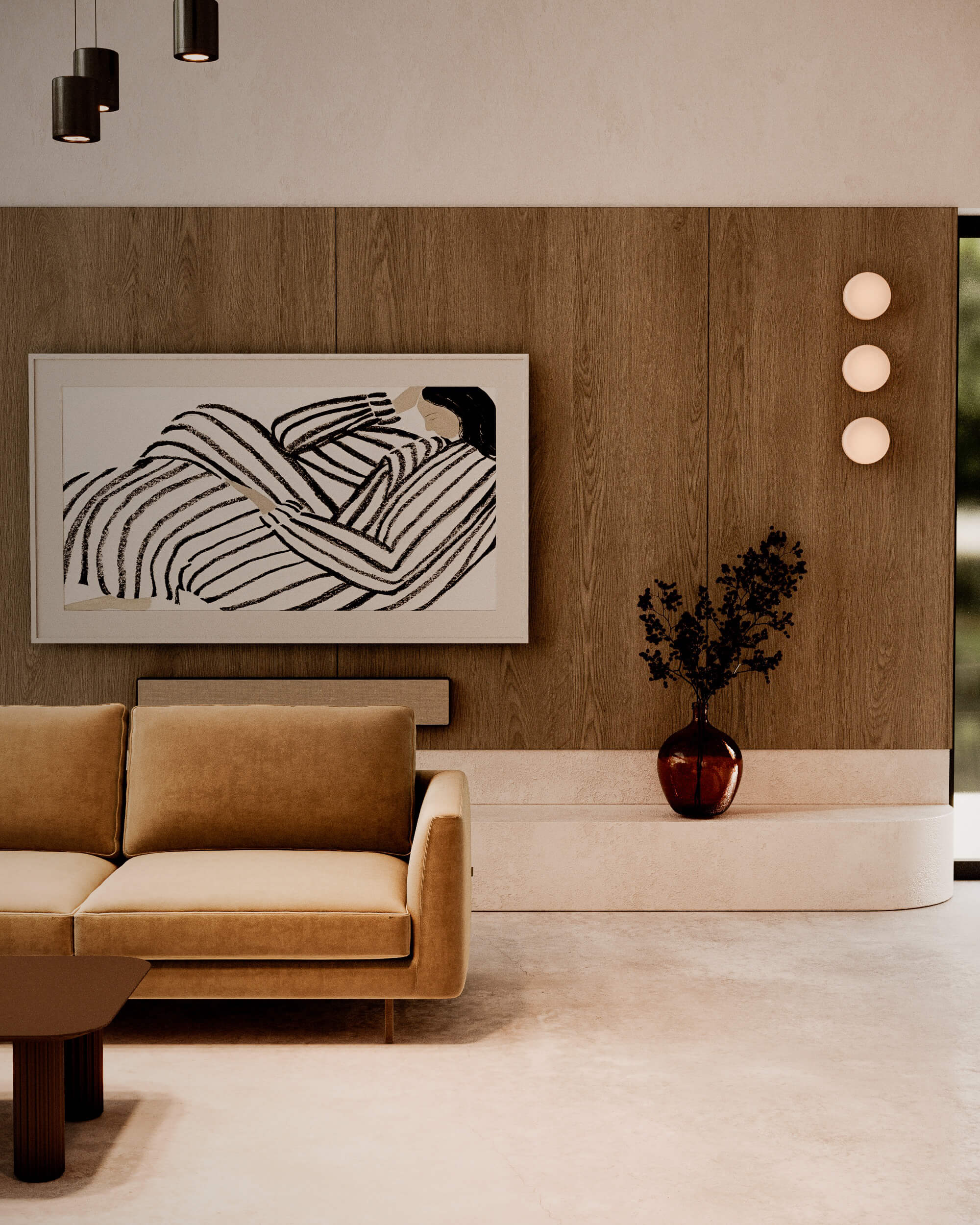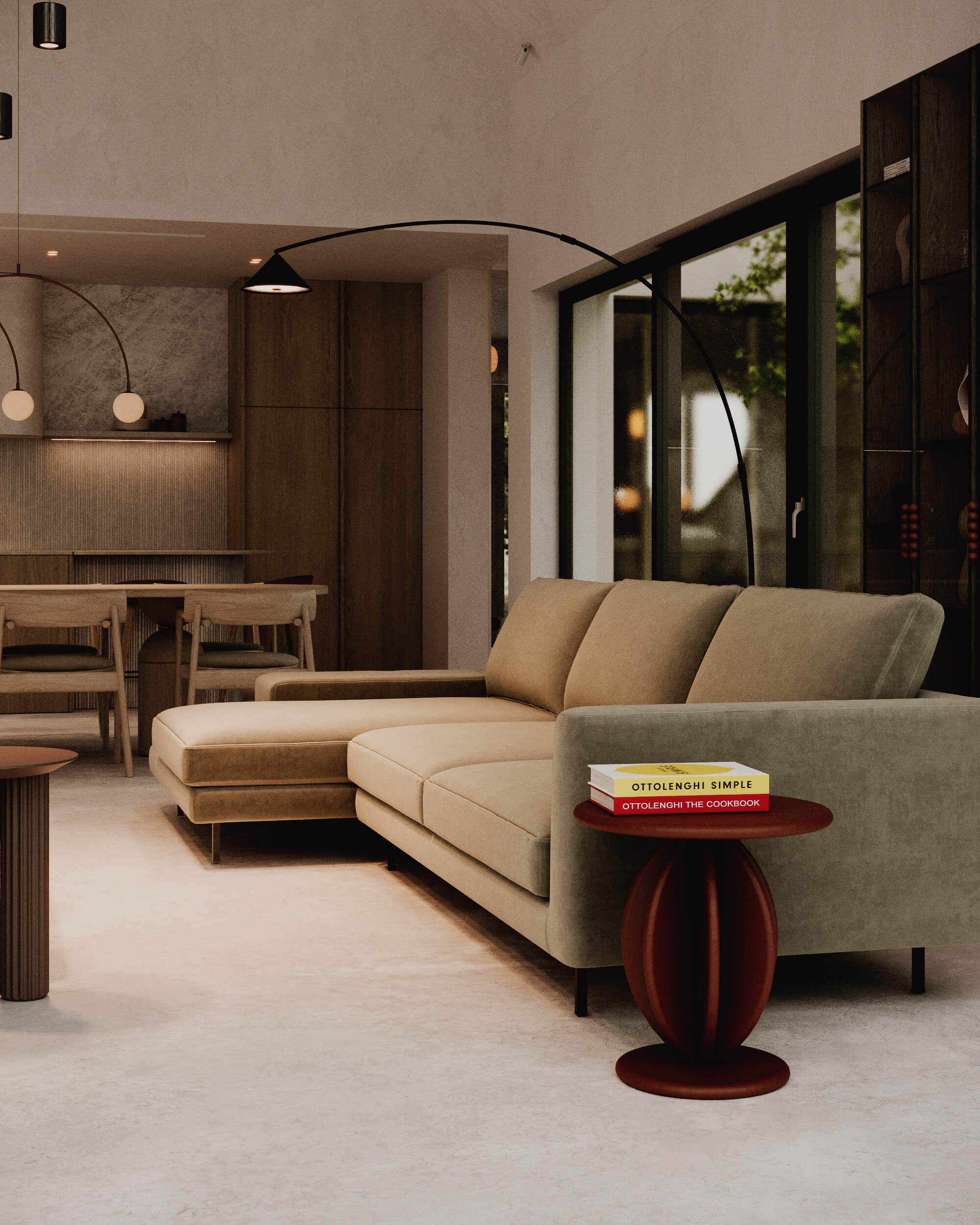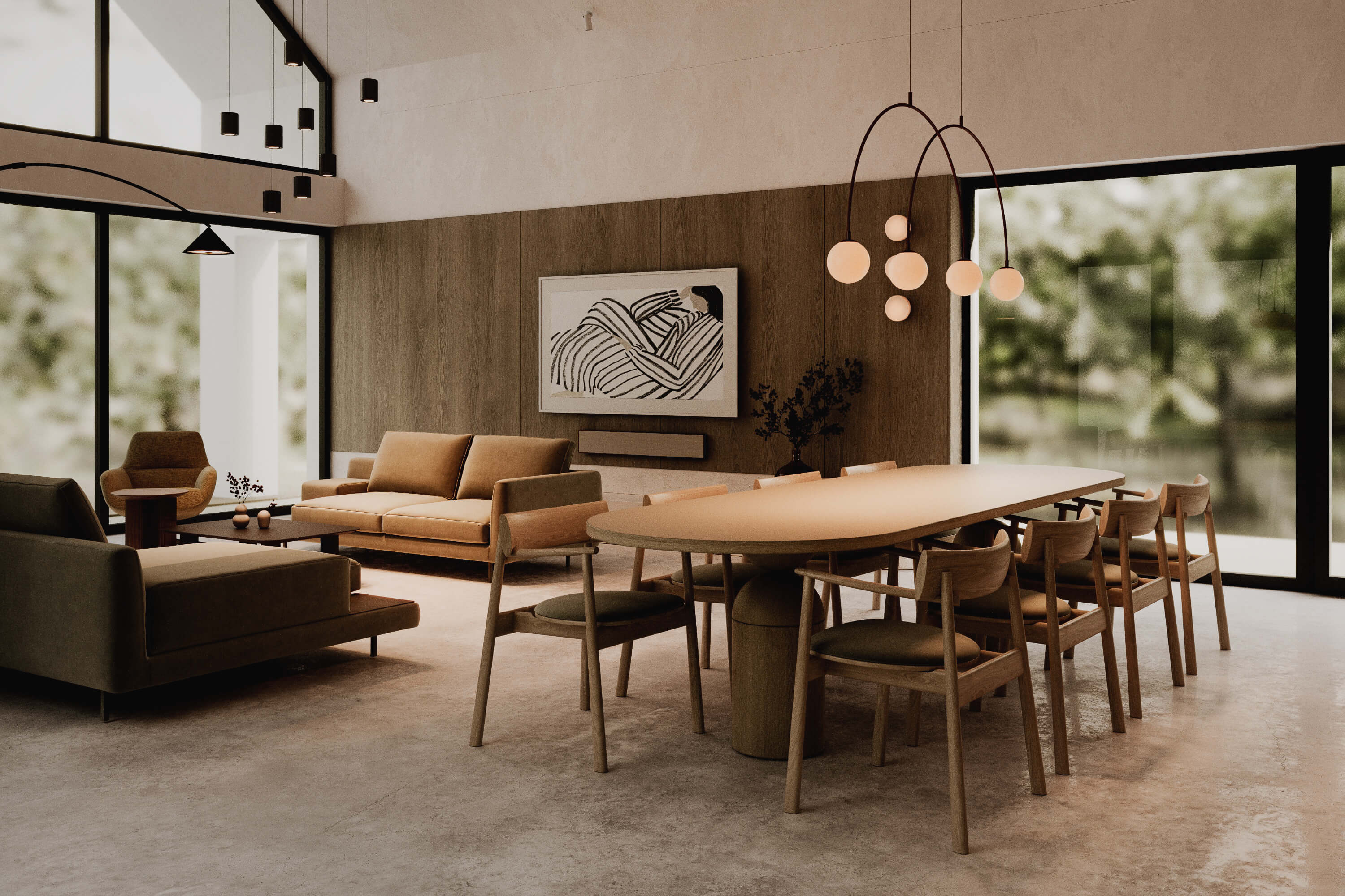 W tym projekcie płynność stała się słowem kluczem. Odeszliśmy od ostrych kątów na rzecz miękkich linii i organicznych kształtów, które naturalnie prowadzą wzrok przez kolejne strefy domu. To wnętrze miało być jak głęboki oddech – kojące, nieśpieszne, bliskie naturze.