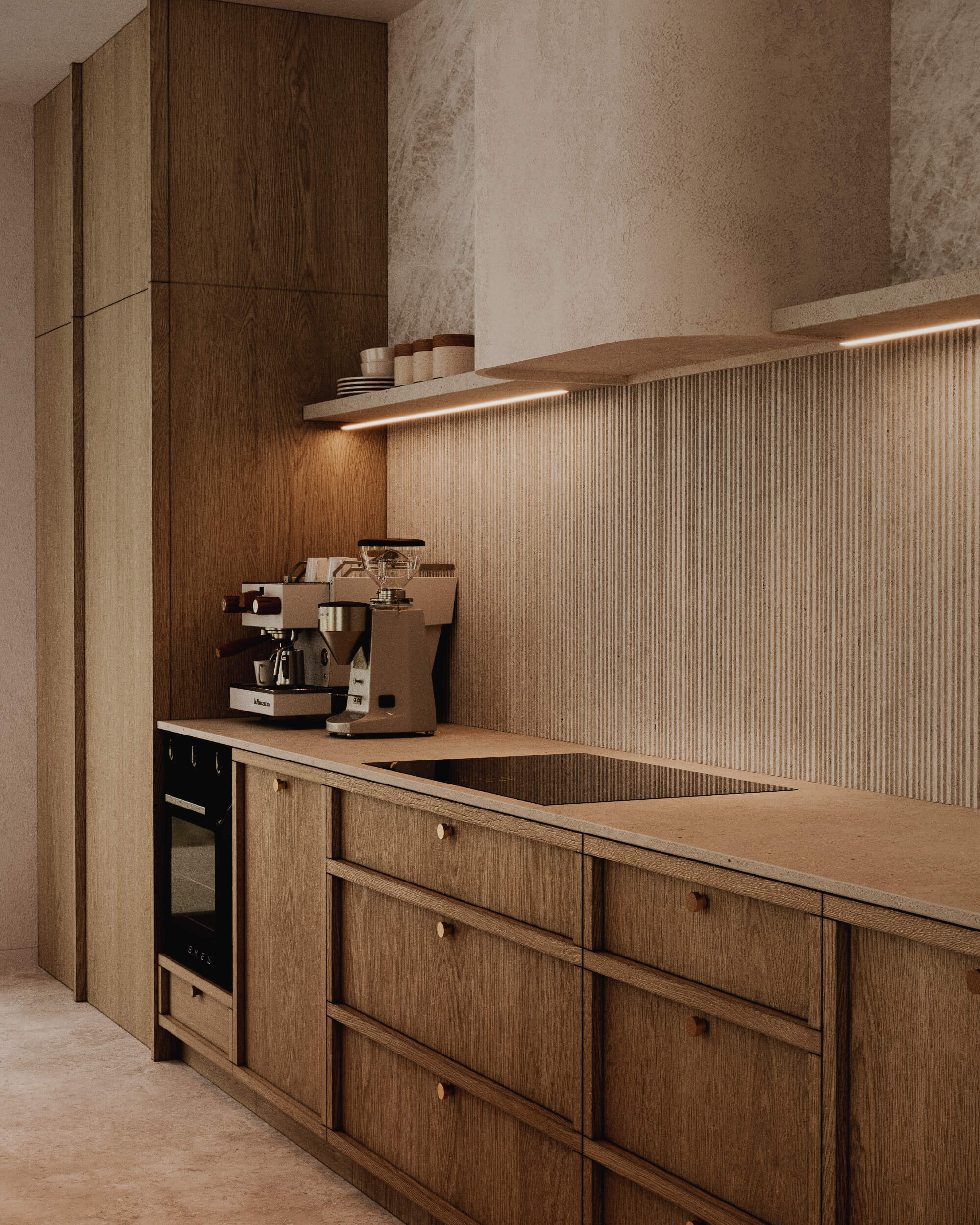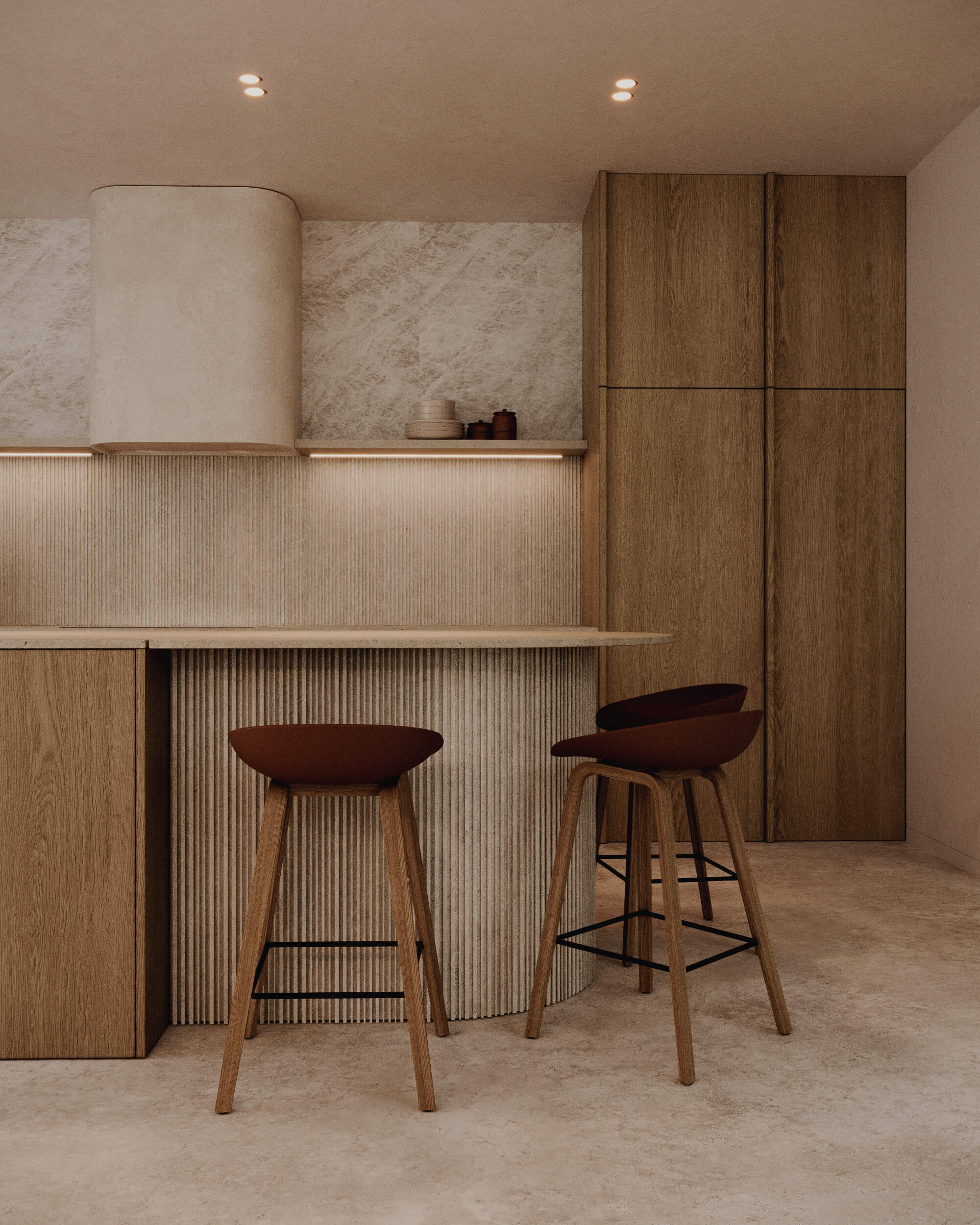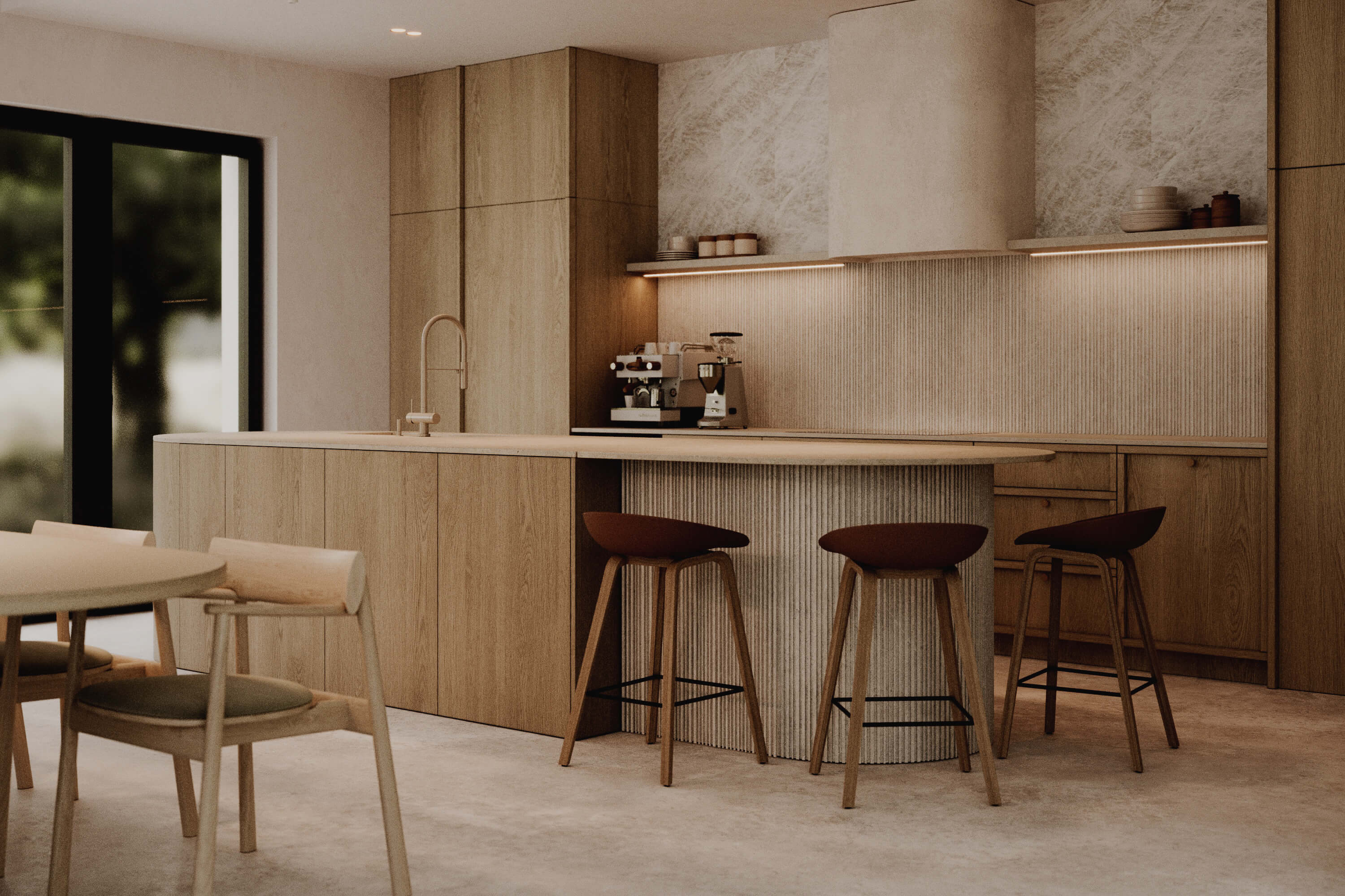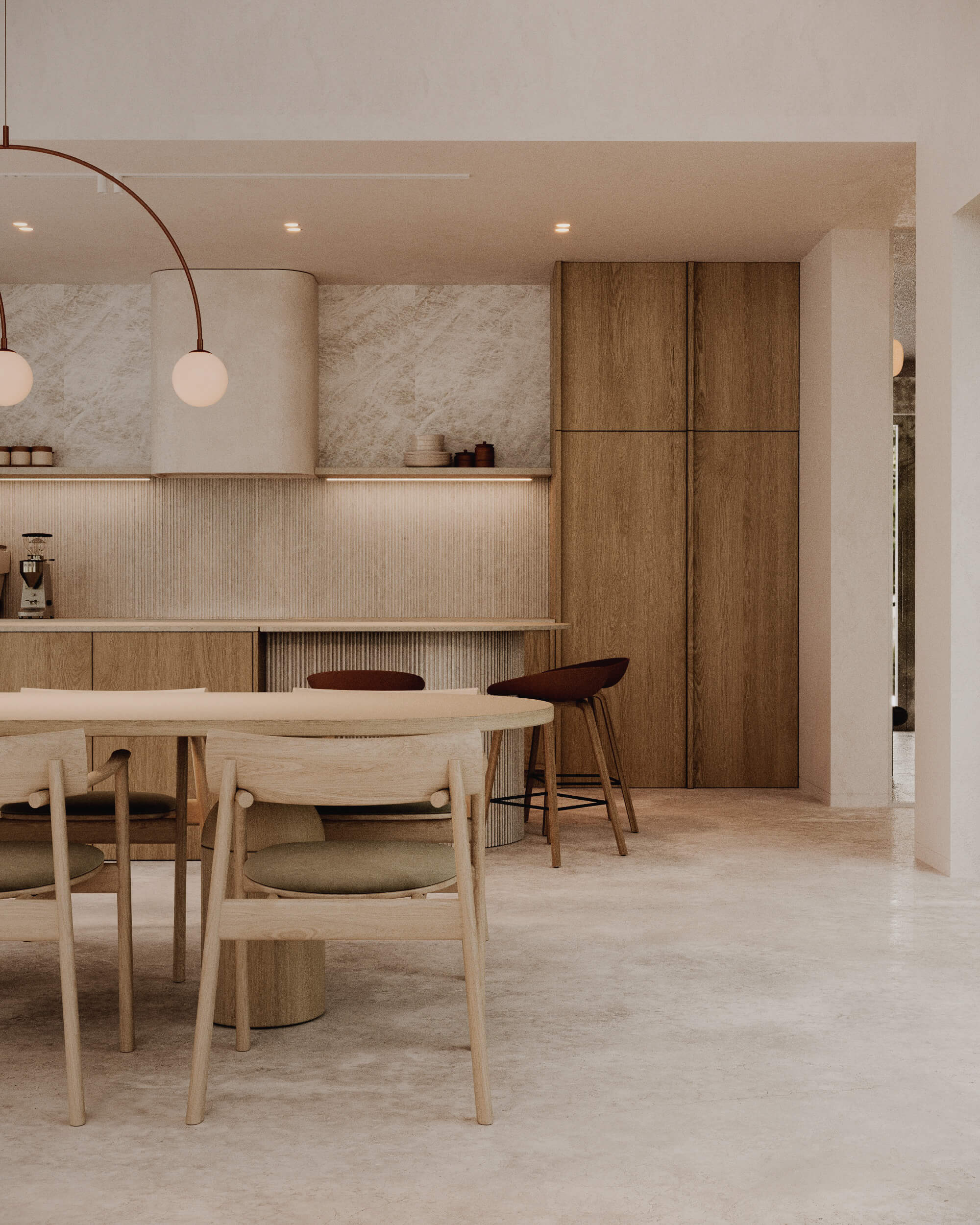 Zależało nam na tym, by architektura wnętrza była tłem dla życia, ale tłem z charakterem. Dlatego kuchnia zyskała rzeźbiarską, ryflowaną wyspę, a strefa dzienna otworzyła się na ogród, zacierając granicę między tym co w środku, a tym co na zewnątrz. Światło odgrywa tu rolę głównego narratora – miękko ślizga się po fakturach ścian i drewna, zmieniając nastrój wnętrza w zależności od pory dnia.
