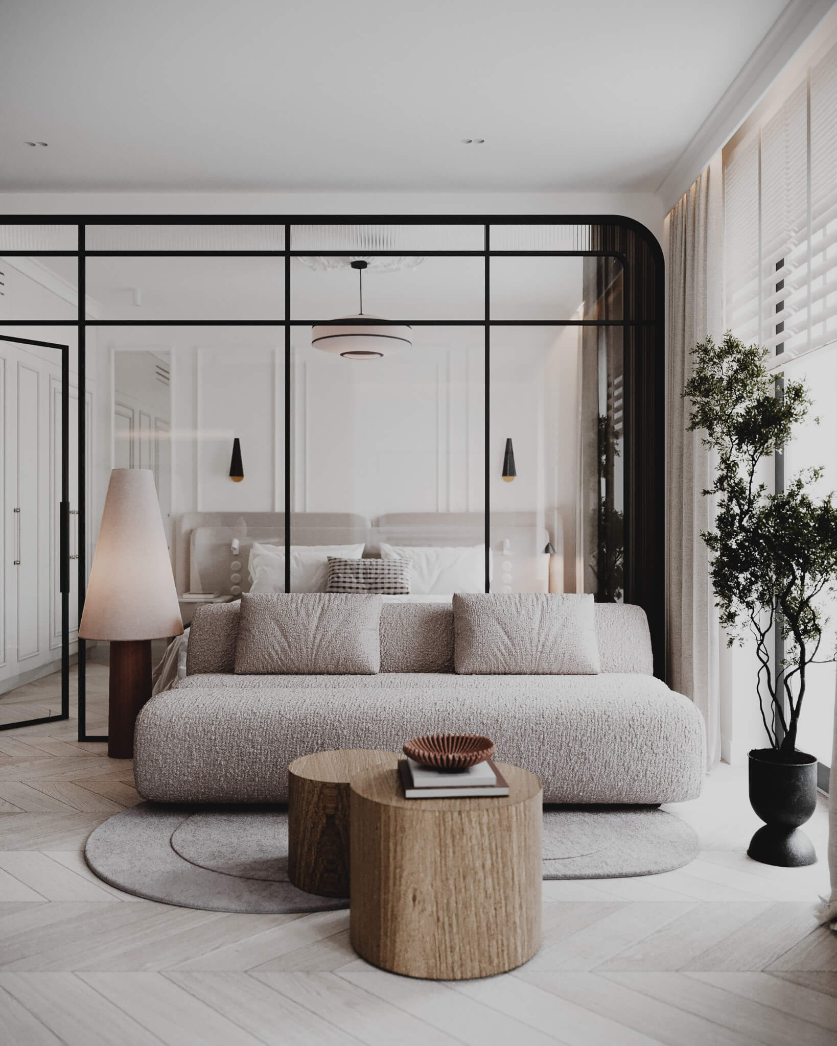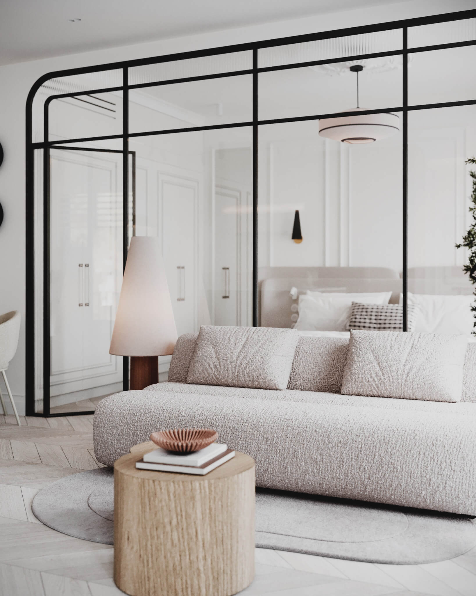 W strefie wypoczynkowej postawiliśmy na zmysłowość faktur. Mięsista, boucle sofa i miękkie tkaniny kontrastują z industrialnym charakterem szklanej ściany, wydzielającej sypialnię. To rozwiązanie nawiązuje do klimatu dawnych paryskich pracowni artystycznych – pozwala zachować przepływ światła, jednocześnie budując intymność.