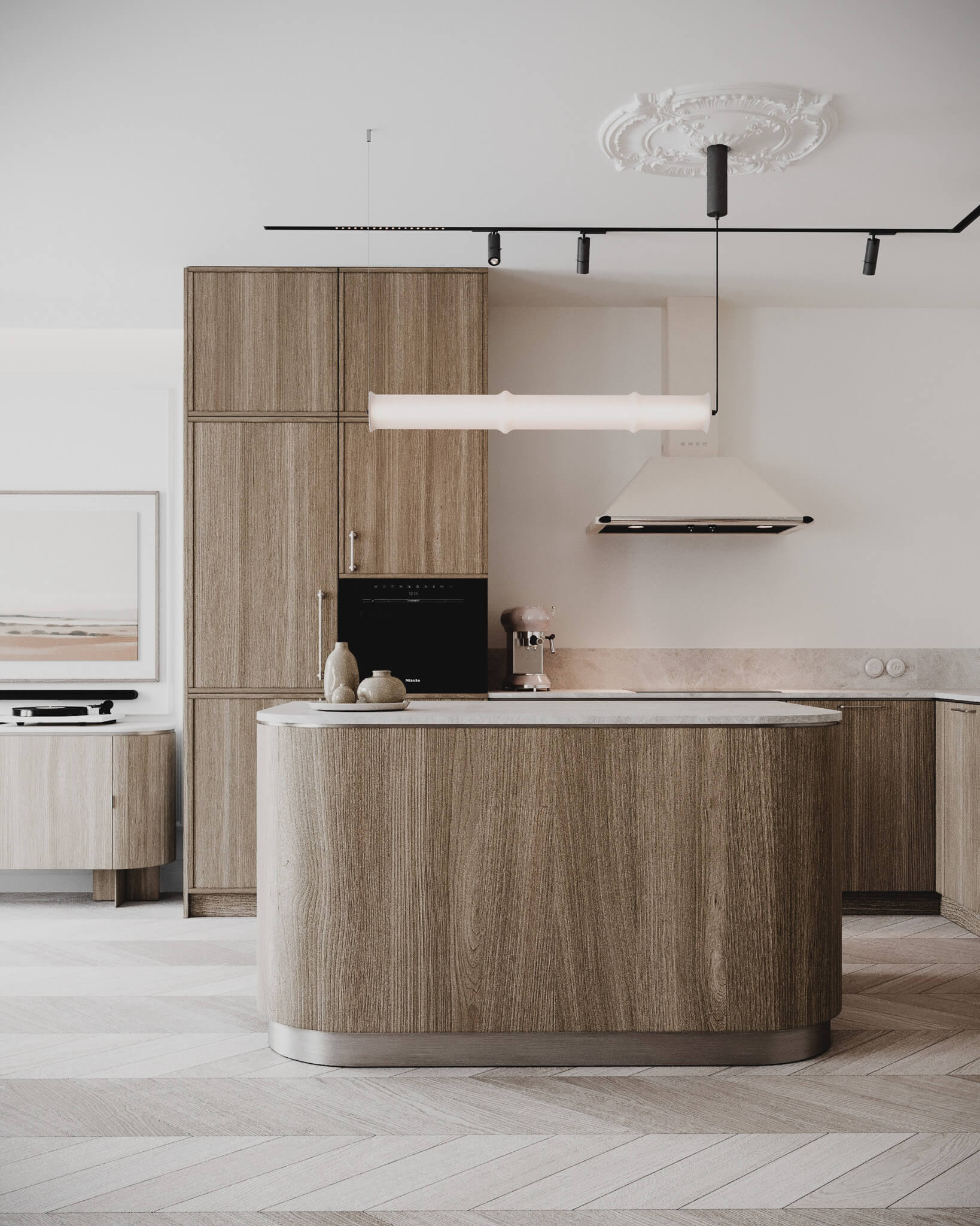 Bazę wnętrza zbudowaliśmy na klasyce. Jasna, dębowa jodełka francuska na podłodze i delikatne sztukaterie na ścianach to ukłon w stronę tradycji. Te elementy tworzą eleganckie, białe płótno, które jednak nie onieśmiela, lecz zaprasza do środka.