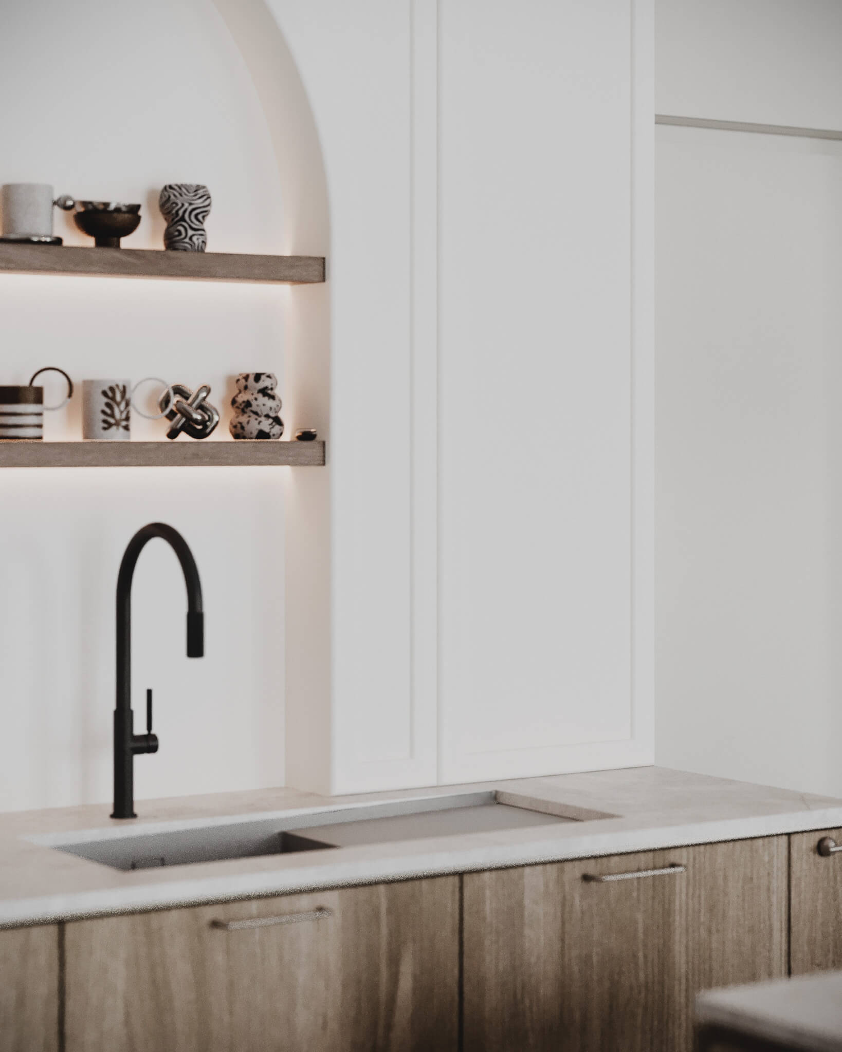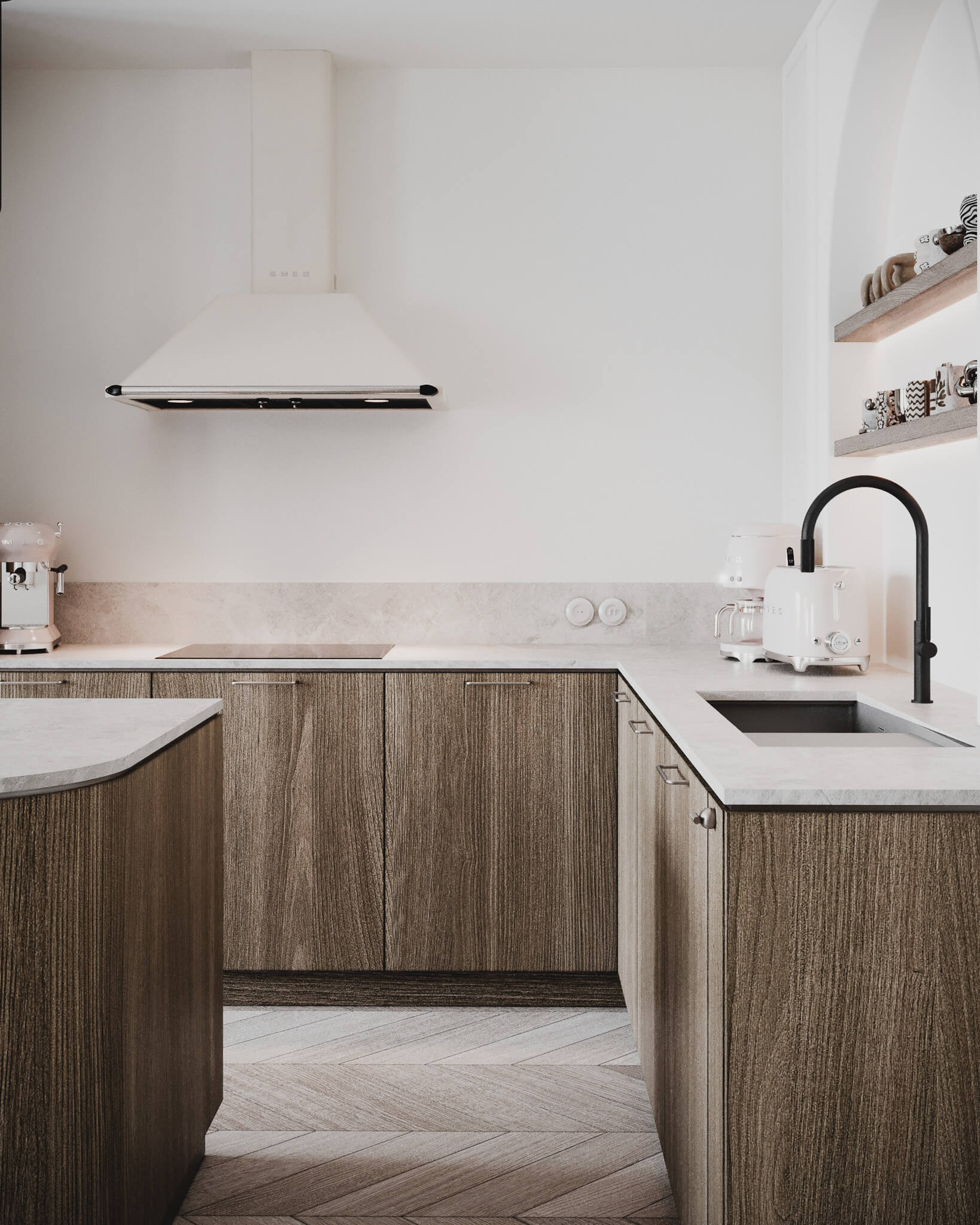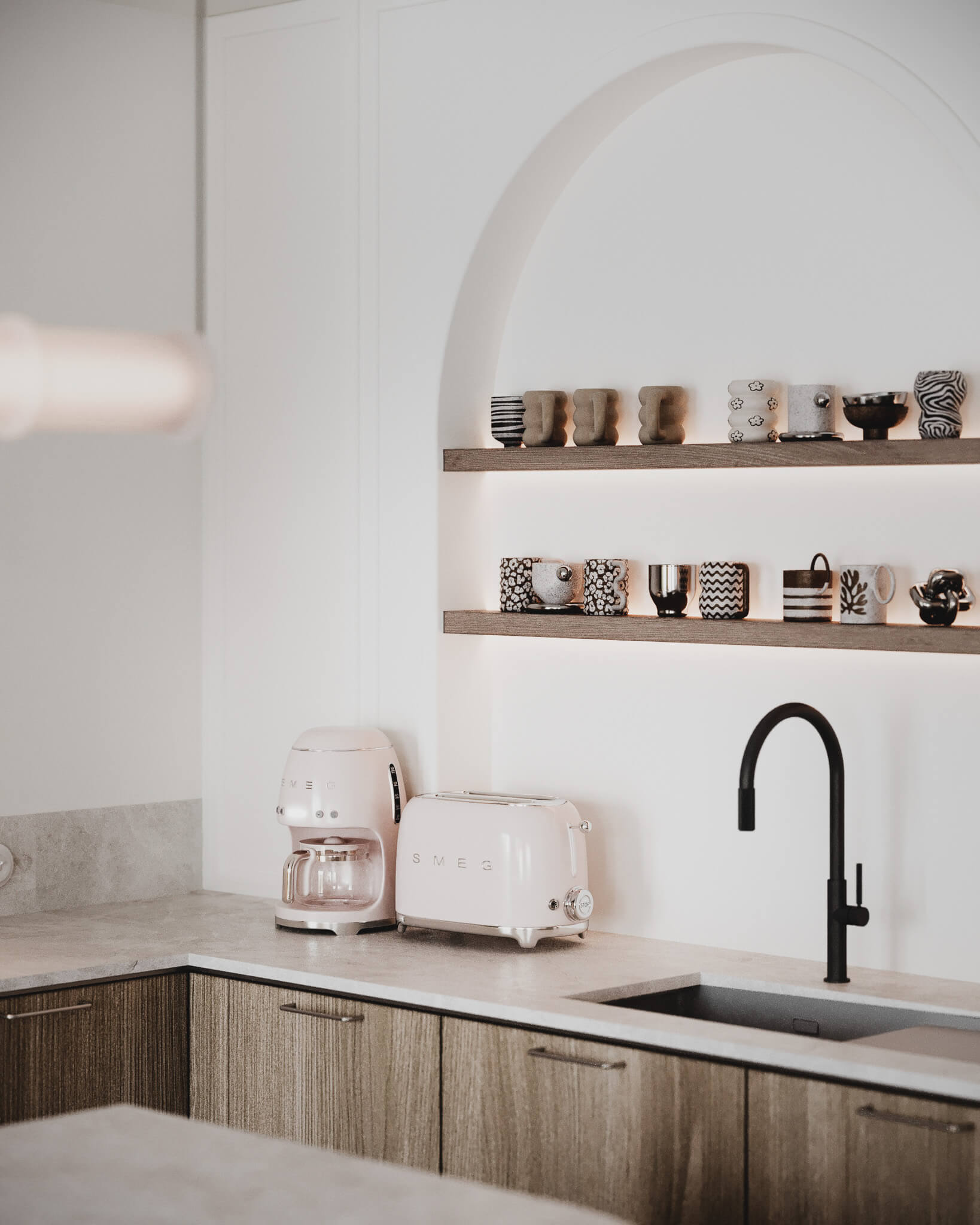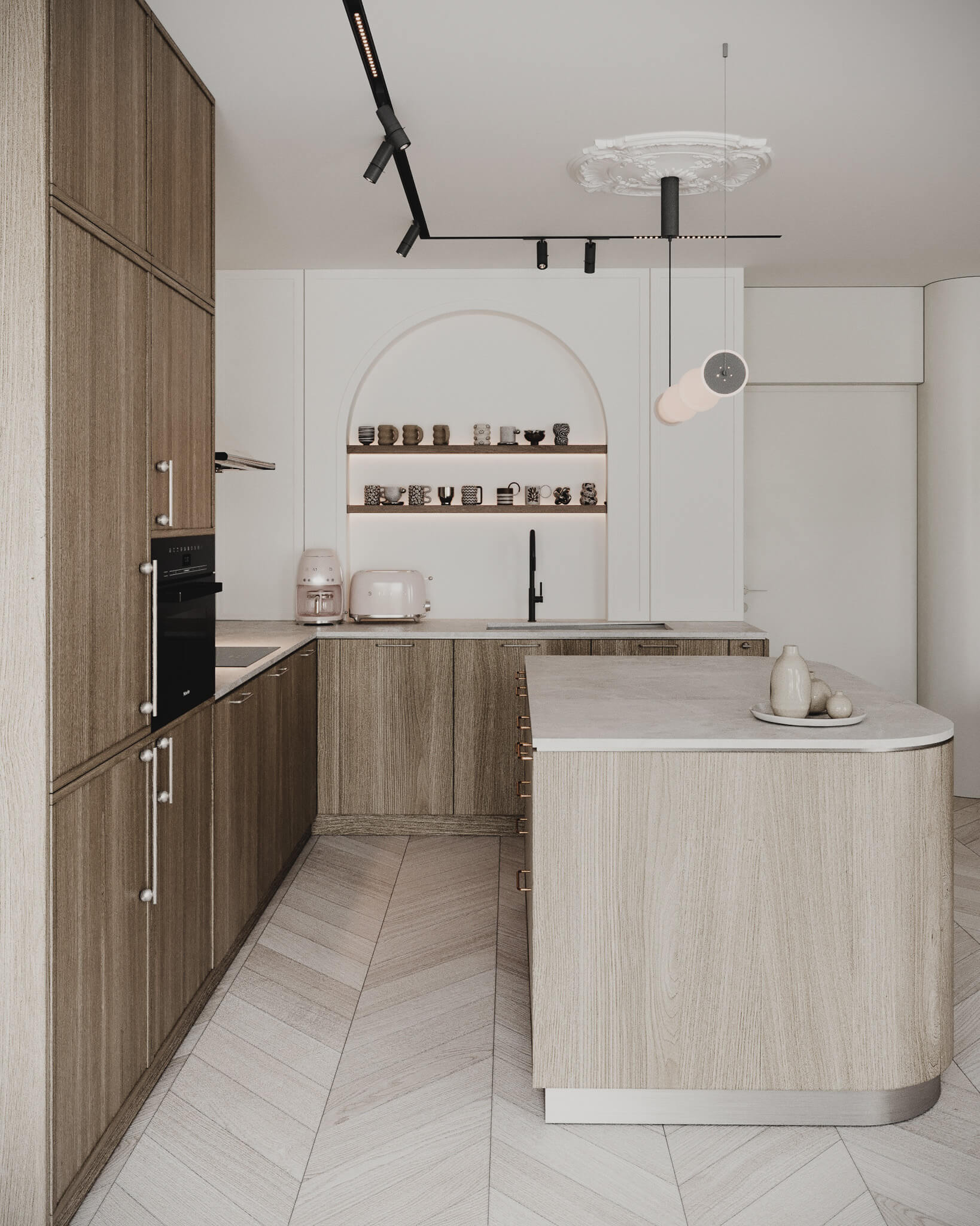 Sztywność klasycznych podziałów przełamaliśmy łagodnością form. W kuchni króluje motyw łuku – widoczny w dekoracyjnej wnęce z półkami – oraz zaokrąglona wyspa, która zaprasza, by się przy niej zatrzymać. Pastelowe akcenty i stylizowane AGD wprowadzają tu nutę romantyzmu, sprawiając, że kuchnia staje się sercem domu w dosłownym tego słowa znaczeniu.